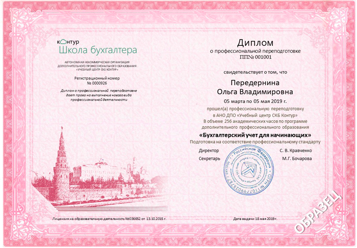 По окончании обучения выдаётся диплом о профессиональной переподготовке. Диплом даёт соответствие профстандарту «Бухгалтер» (по коду А) и поможет Вам при приеме на работу или при переходе на новую должность.