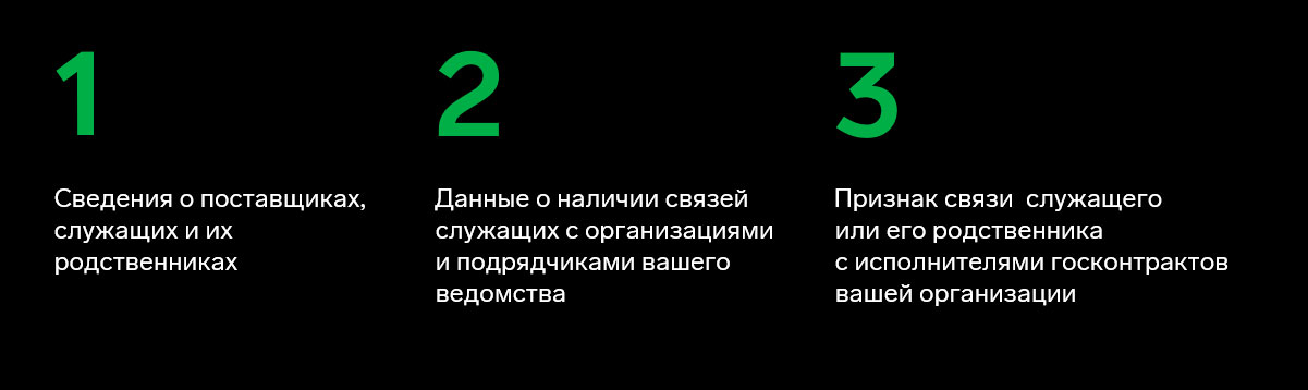 В соответствии с требованиями ФЗ № 79, № 25 и № 273 и рамках исполнения своих обязанностей службы противодействия коррупции проводят регулярные мероприятия для выявления конфликта интересов государственных и муниципальных служащих, и их родственников. Сбор, анализ и мониторинг информации занимает недели, а иногда и месяцы.