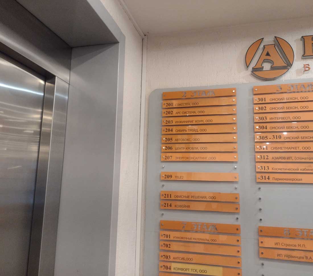 Здание бизнес - центра и указатели в холле